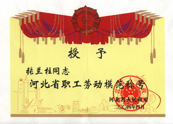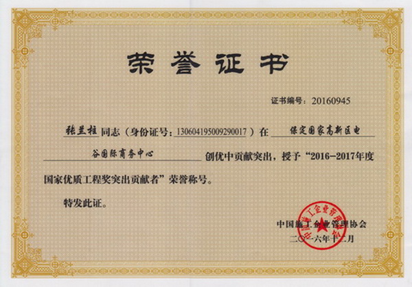 張?zhí)m柱同志以他杰出的工作業(yè)績(jī)被各級(jí)領(lǐng)導(dǎo)機(jī)關(guān)授予:全國(guó)、河北省、保定市建筑業(yè)優(yōu)秀企業(yè)經(jīng)理;優(yōu)秀企業(yè)家;優(yōu)秀共產(chǎn)黨員;優(yōu)秀黨務(wù)工作者;優(yōu)秀思想政治工作者;安全生產(chǎn)、工程質(zhì)量管理先進(jìn)個(gè)人;河北省優(yōu)秀經(jīng)理管理者;河北省建設(shè)系統(tǒng)勞動(dòng)模范;河北省勞動(dòng)模范等榮譽(yù)稱號(hào)